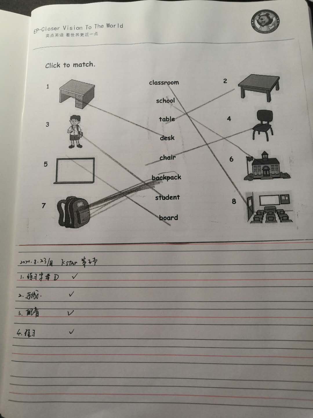 K star 第五节课 课程内容Dear all parents: 上节课我们结束了第一单元的学习,进入了第二单元的学习!单词要花点时间记一下哈!练习对话-Are they blue?-Yes,They are.-No,they aren't.-What color are they?-They're white. 课后作业 连线 完成字母D的书写作业✍️ 记录下孩子练习第二单元的视频周日前分享到群 完成配音并发送到群里 [1 school](https://children2.qupeiyin.com/index.php?m=home&c=show&a=share&sharefrom=oneself&id=MDAwMDAwMDAwMLCdumKAsciZsM2irg)