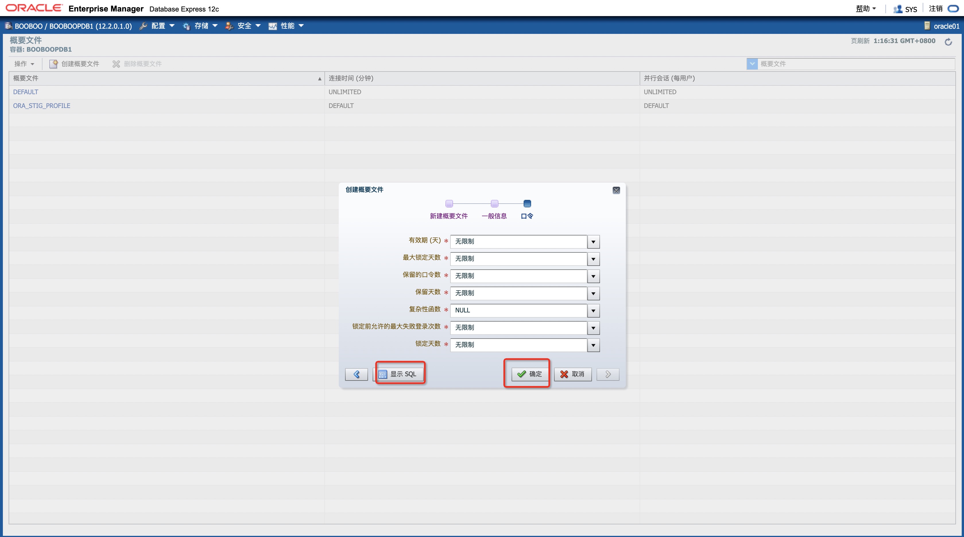 e. Create Profile Dialog: Password Review the Password options. All should be set to default values of Unlimited or Null. Click Show SQL to review the SQL command for this task.