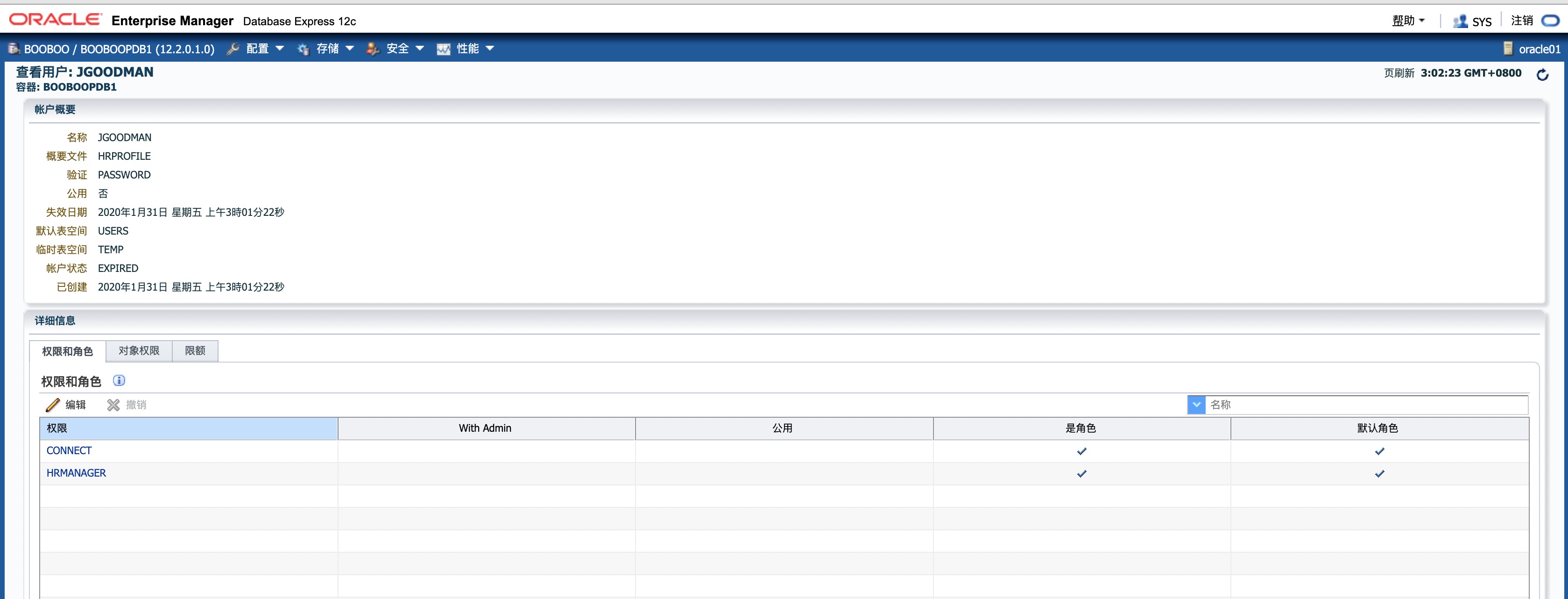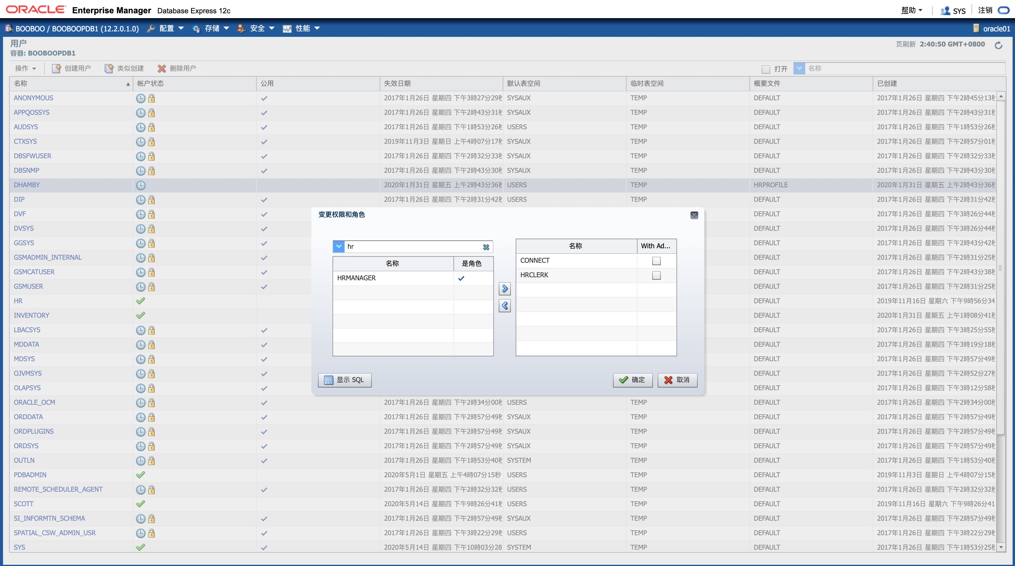 1. 创建角色 HRMANAGER : 对 HR schemainsertdelete 权限,并将角色 HRCLERK 授权给角色 HRCLERK