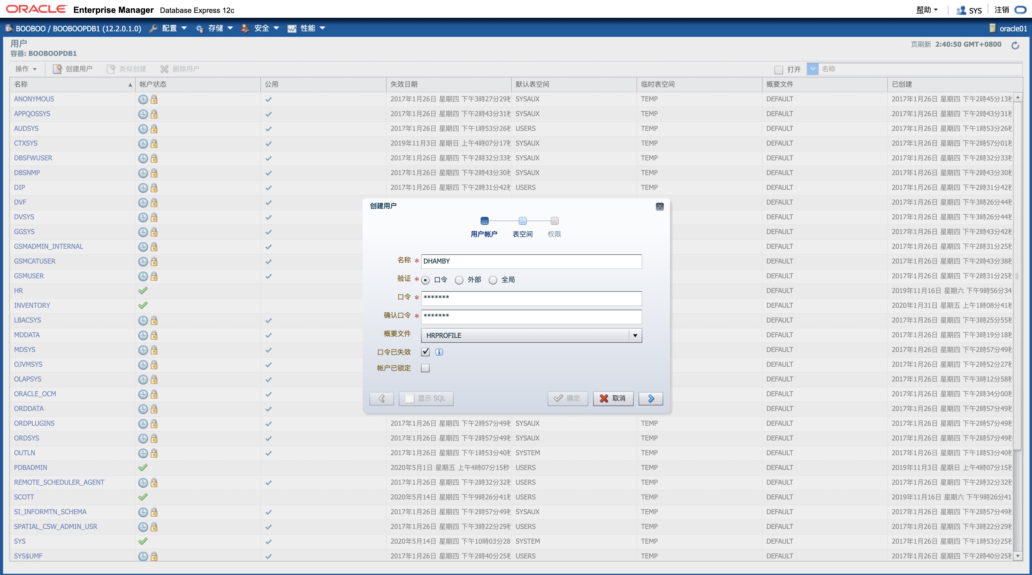 如何使用Oracle Enterprise Manager Database Express(EM Express)创建和管理用户帐户。它包含以下部分: