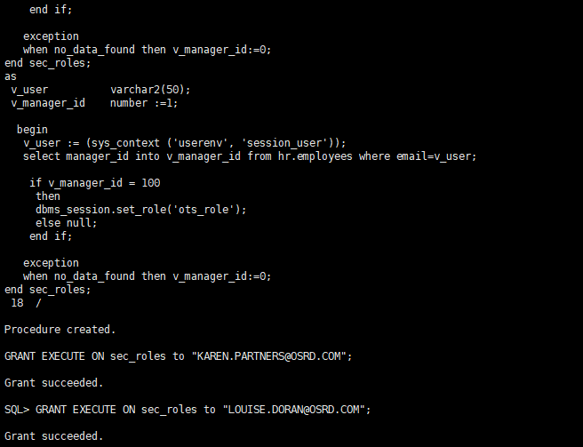 该存储过程中,限定只有当雇员的manager_id为100时,才可以设置为ots_role角色。拥有查询oe.order 和 oe.customer 的权限。