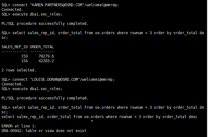 您需要授予 oe.orders 和 oe.customers 的 select 访问权限。 然后,向每个用户授予此角色并将他们的配置文件设置为 none。