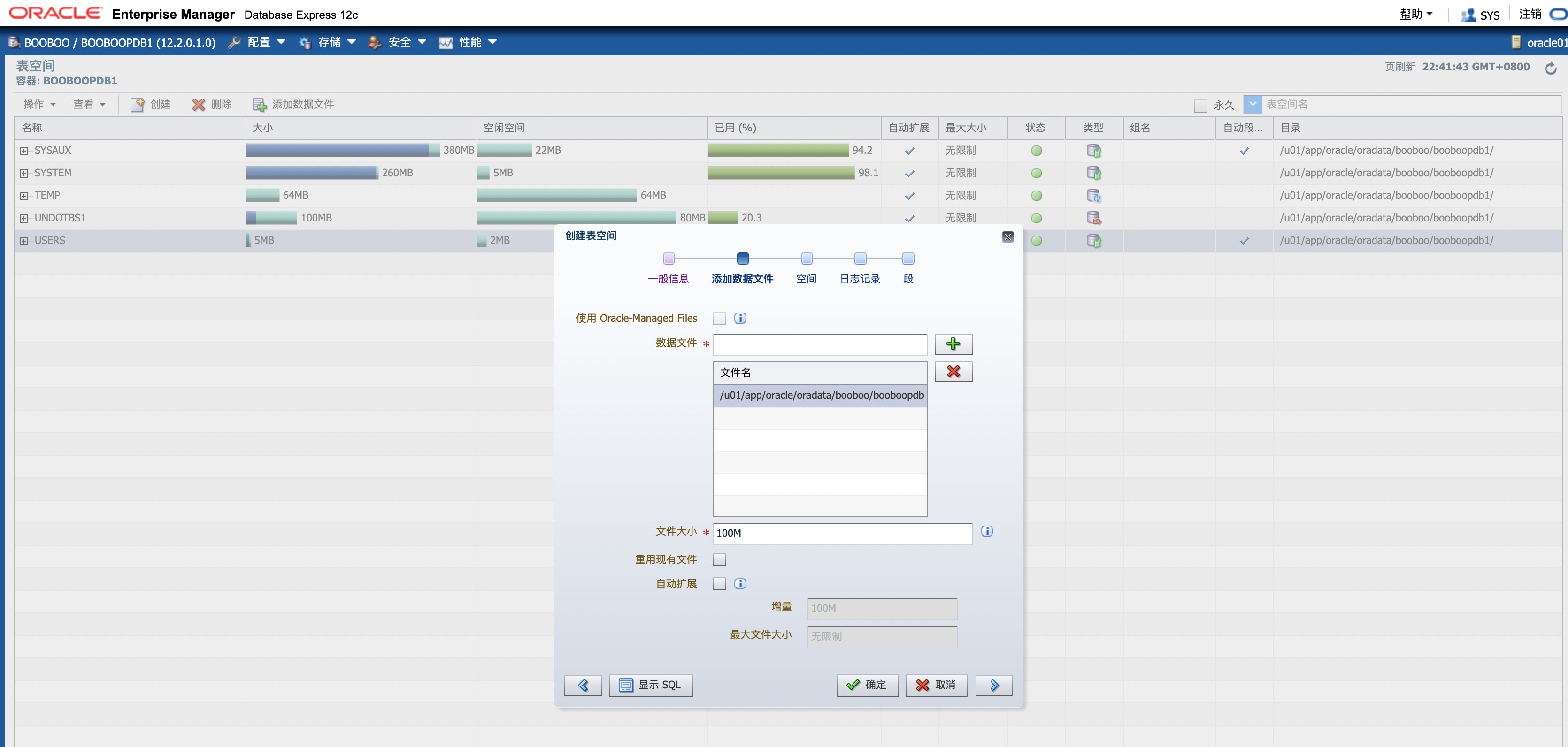 Disconnected from Oracle Database 12c Enterprise Edition Release 12.2.0.1.0 - 64bit Production您将使用两种不同的方法来完成此任务。1)将当前数据文件的大小增加到