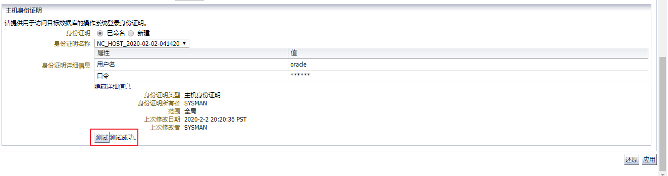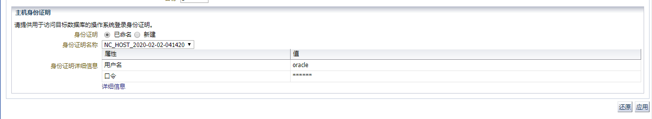 滚动到页面底部。在主机身份证明部分,选择新建。在用户名字段中输入oracle。在password中输入操作系统密码并确认密码字段。单击Test以确保正确输入了值。(如果已经配置过了,就选择已命名)