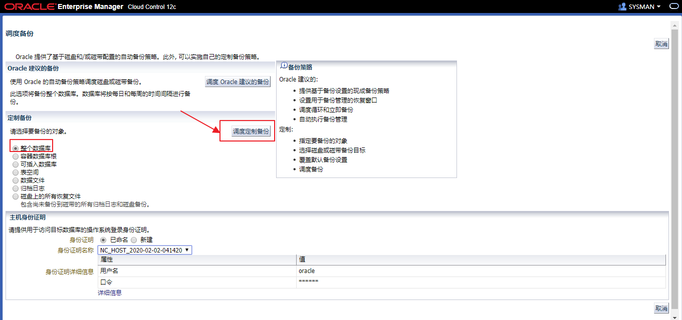 在自定义备份部分,选择整个数据库。确认主机凭据已设置为oracle用户名和密码。单击调度定制备份。