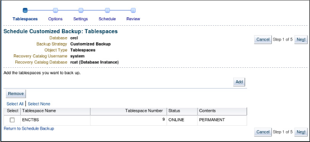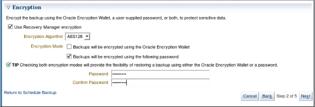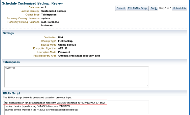在实践中,您将创建ENCTBS表空间的密码加密备份。该练习显示了Cloud Control中的步骤。有关命令行,请参阅步骤10中的RMAN脚本。