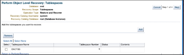 5.选择 ENCTBS 表空间,然后单击“ 选择”按钮。