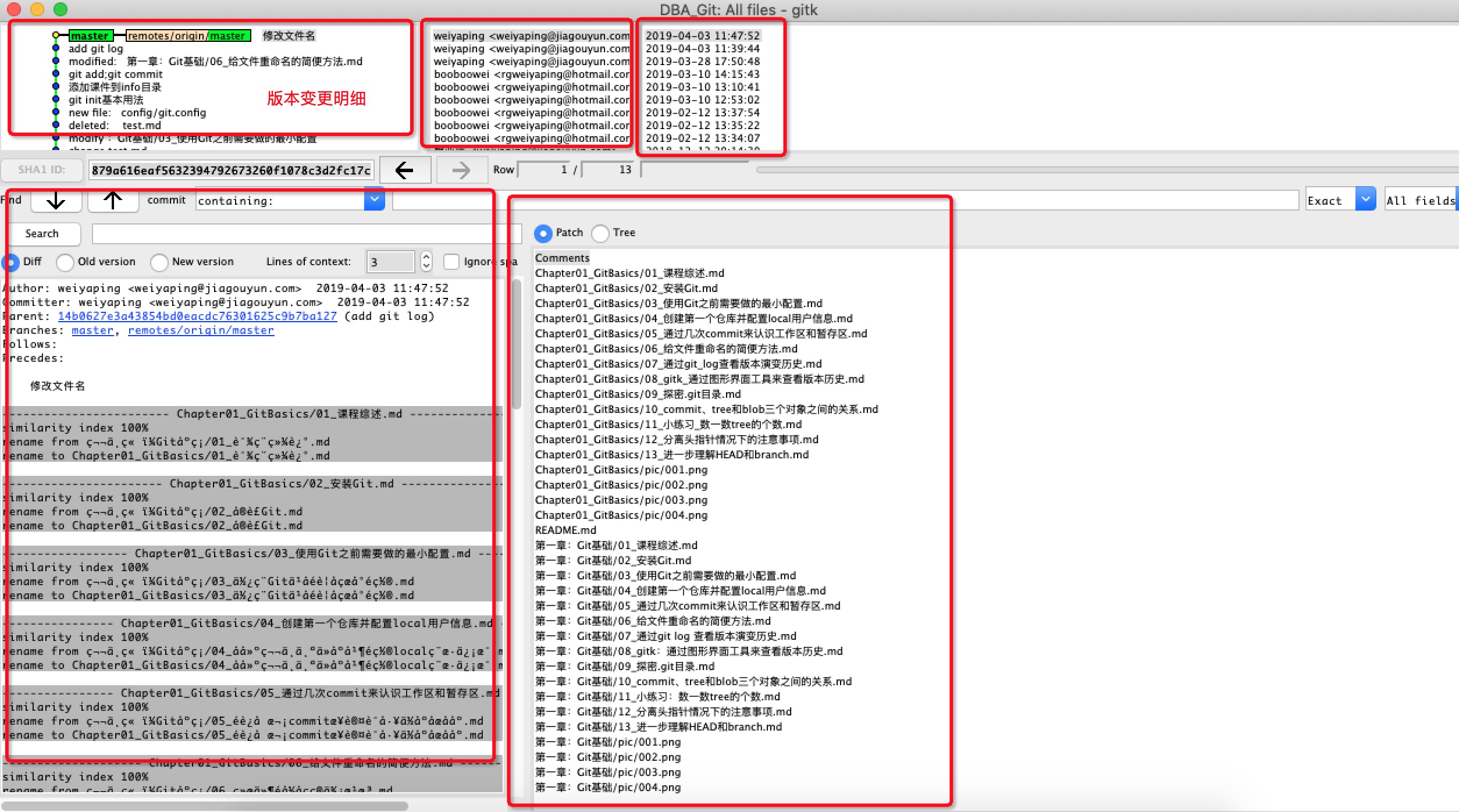 • gitk 后面可以跟上文件的路径,这样能看单个文件的修改历史的具体内容,非常有用;