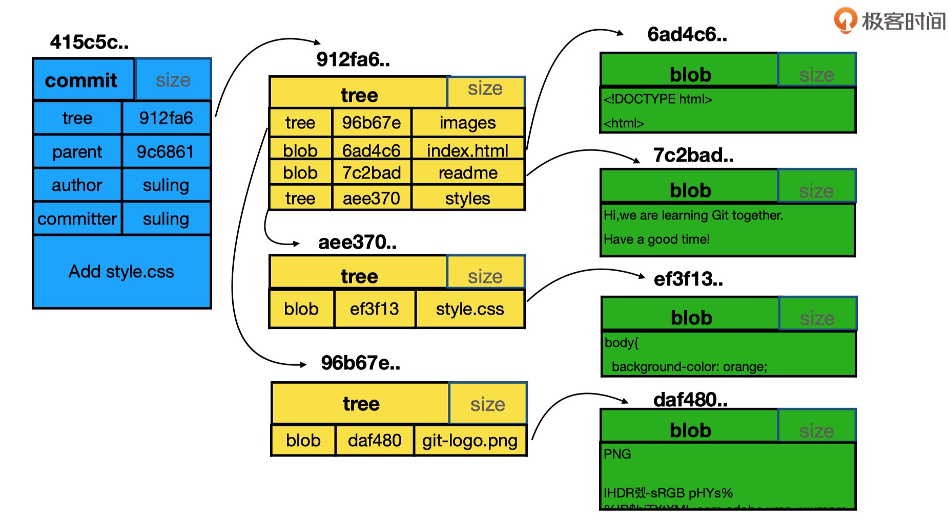 commit、tree和blob三个对象之间的关系