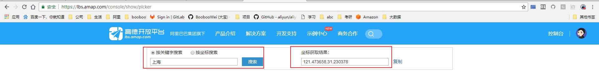 为了让地图显示上海,我们需要获取上海市的坐标位置。可以通过高德地图开发者工具——坐标拾取器 来获取。