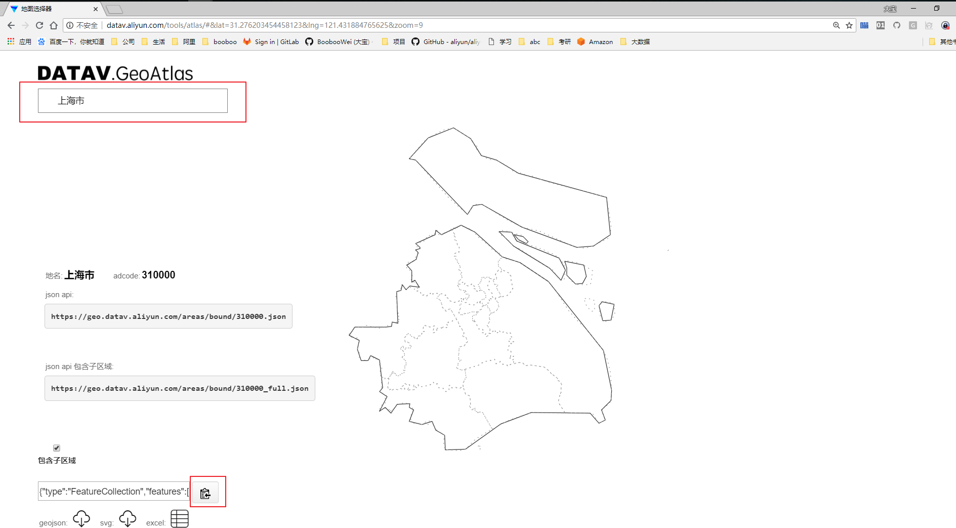 坐标拾取器:详细地址与精准坐标之间的相互转化。如下图,输入上海,右侧坐标获取结果即可显示对应的坐标信息。
