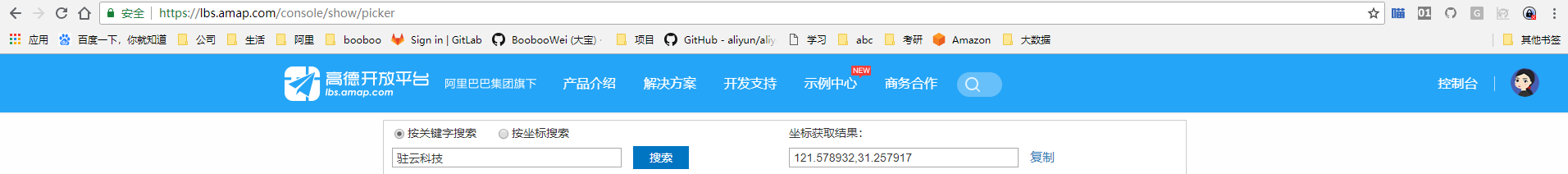 通过高德地图开发者工具——坐标拾取器 来获取 驻云科技 的位置121.590433,31.204561
