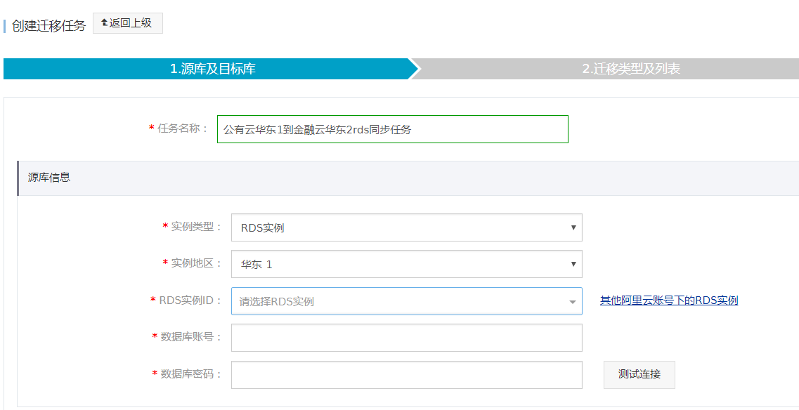 在这个步骤中,主要配置迁移任务名称,迁移源实例及目标实例连接信息。其中: