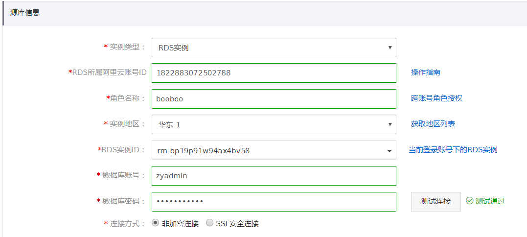 | 角色名称 | booboo | 源RDS实例所属云账号授权的角色,具体创建看帮助 |