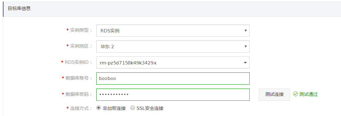 | 数据库账号 | booboo | 目标RDS实例数据库账号 |