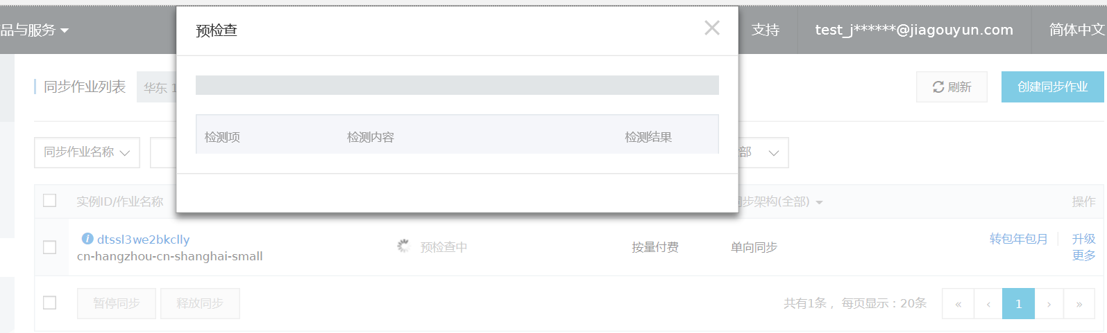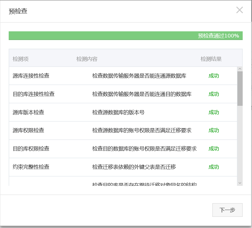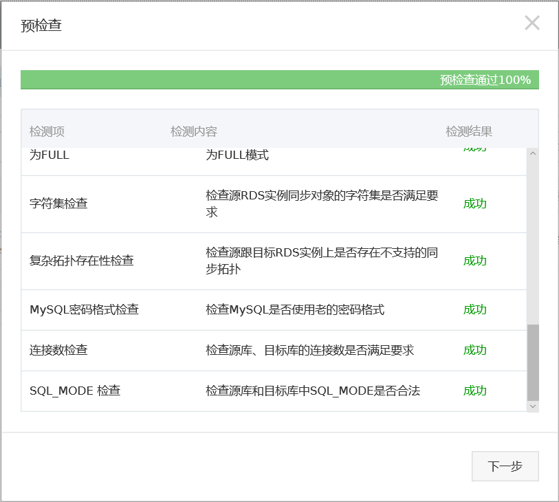 注意,这里面同步初始化只勾选全量数据初始化,不进行结构初始化,因为上面的结构迁移已经将同步对象的结构定义迁移到目标RDS实例了。预检查。 当预检查成功后即可启动同步任务。